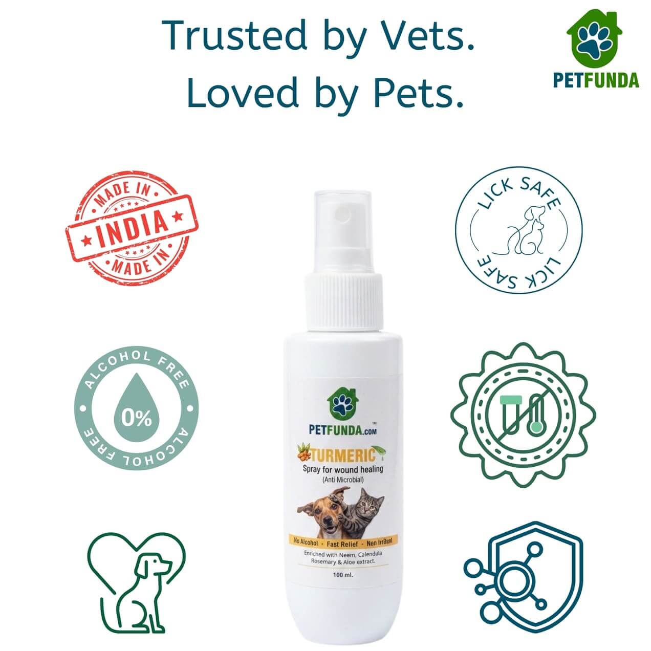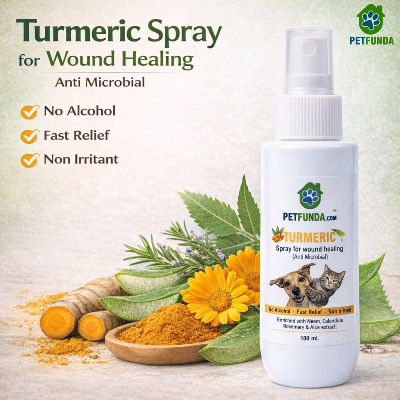 Petfunda Turmeric Healing Spray is a powerful pet wound healing spray for dogs and cats that treats cuts, scratches, hot spots, rashes, itchy skin, skin infections, and minor wounds. Enriched with turmeric, neem, aloe vera, rosemary, and oatmeal, it provides anti-microbial protection, soothes irritation, and supports fast natural skin recovery.